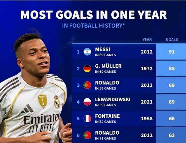 2025年姆巴佩已打进63球,距巅峰C罗仅6球