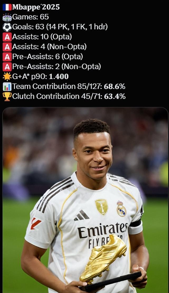 | 今天凌晨,姆巴佩在西甲对阵阿拉维斯的比赛中打进一球,这来他2025年就打进了63球了,63球在德转的自然年的进球排名中,能够排在第6的位置,和2012年的C罗并列。前五分别是梅西的91球、盖德-穆勒的85球、C罗和莱万的69球、以及方丹的66球。 值得一提的是,德转还遗漏了不少历史球员的数据,比如葡超历史射手王(332球)费尔南多-佩罗特奥的数据,1938年年仅20岁的他打进了69球。比如贝利在1958年,年仅18岁的他在那个自然年就打进了75球。再比如1976年打进70球的济科,2000年打进75球的罗马里奥。以上数据来源M君的资料。 2025年皇马还剩下两场比赛,一场国王杯和一场西甲,如果姆巴佩会在国王杯对阵西协甲球队塔拉韦拉的比赛中出场的话,应该能刷不少进球,塔拉韦拉全队身价只有288万欧,在西协甲他们也是最弱的球队,排名A组第19、倒数第二。 不过参考上赛季同期国王杯第三轮的比赛,姆巴佩当时是作为替补在下半场60多分钟出场的,也许接下来这场国王杯姆巴佩可能不会获得太多出场时间。不过我觉得他也有可能首发踢一个小时再下吧,毕竟现在他的年度进球数据正被各大媒体盯着报道呢,作为在足球数据风暴环境下成长起来的一代球员,姆巴佩应该也很想再多进几个球。 毕竟目前姆巴佩今年在皇马的年度进球数已经来到了56球,距离他的偶像C罗保持的皇马球员自然年进球纪录59球只差了3个球了。 再来说说姆巴佩目前63个自年然进球属于什么水平。普斯卡什自然年最多进过60球、尤西比奥这个数据是57球、大罗是59球、亨利是46球,你像欧文、维埃里、克鲁伊维特、因扎吉、阿圭罗、巴蒂、德罗巴、鲁尼、本泽马、伊瓜因这些大家耳熟能详的射手,最高产的一年也才30多个球。 可见如今的姆巴佩,在进球能力方面和巅峰C罗已经不相上下了。 (仰卧撑/足球狠话哥邱翼曦) |