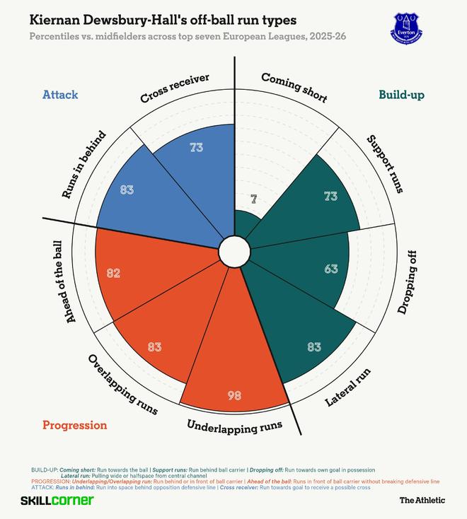 “你为什么不问问他为什么没进英格兰队?” 这是上周六在希尔迪金森球场,当迪尤斯伯里-霍尔结束赛后媒体职责时,一位安保人员向记者们提出的问题。 这位埃弗顿中场球员对此番落选报以佯装愤怒的回应:一个苦笑,然后朝聚集的媒体成员们耸了耸肩,随即消失在球员通道里。这不太可能是在本赛季中最后一次有人提起这位27岁球员的成年代表队梦想了。 迪尤斯伯里-霍尔很可能正处在其职业生涯的最佳状态。这位出生于诺丁汉、在莱斯特郡长大的前莱斯特城及切尔西球员,已经拒绝了爱尔兰(凭借其家族背景他有资格代表爱尔兰出场)的示好,并告知了俱乐部队长兼爱尔兰主力科尔曼,他希望代表自己的出生地英格兰出战。迪尤斯伯里-霍尔目前尚未在任何年龄段为任何代表队出场过。 在一个以世界杯为终点的赛季中获得英格兰成年代表队的一席之地,鉴于主教练图赫尔手中中场人才的深度,这将是一项艰巨的任务。但迪尤斯伯里-霍尔的表现值得关注。距离在美国、加拿大和墨西哥开赛的世界杯还剩不到六个月,这些梦想看起来并非那么遥不可及。 “我现在的感觉可能是前所未有的好,我现在的踢法也达到了我最佳水平之一,”他在上周末主场3-0战胜诺丁汉森林的比赛后告诉记者,那场比赛中他打入一球并助攻一次。“我开始找到节奏了。当你踢了几场表现平平的比赛,每个人就开始议论纷纷。但你必须记住,有很多新球员,包括我自己,正在适应新的球队、新的球场、新的环境。这需要时间,但我已经开始真正安定下来,享受其中了。” 迪尤斯伯里-霍尔今年夏天以2500万英镑从切尔西转会而来,这似乎给了他新的生机。他在离开儿时俱乐部莱斯特城后,在伦敦度过了唯一一个赛季,并赢得了两座奖杯——上赛季的欧协联和今夏的世俱杯。但在短短六个月内,他已从斯坦福桥的边缘球员变成了默西塞德的关键球员。 “我不后悔去那里(切尔西),”他在八月份3-2客场战胜狼队后说道。“我发挥了重要作用,所以我对在那里的那一年感到满意。但当时是时候继续前进,推进我的职业生涯,并尝试获得稳定的出场机会了。”“对我来说,离开我之前的俱乐部必须是为了一个有吸引力的项目。这确实感觉像是一个新的开始。到目前为止,它向我展示了我所想要的一切。” 迪尤斯伯里-霍尔在埃弗顿开局不错,但在过去一个月里达到了新的高度。他在过去五场比赛中贡献了三球一助,并获得了英超月度最佳球员的提名。他在对阵纽卡斯尔联时那记精彩的安慰球,也是本月英超最佳进球的有力竞争者。他身披埃弗顿球衣的进球数(4球)已经超过了此前为莱斯特城和切尔西总共出战的72场英超比赛(3球)。 由于颇受欢迎,一些球迷将迪尤斯伯里-霍尔、杰克-格拉利什和伊利曼-恩迪亚耶组成的攻击中场三人组称为“The Holy Shinity”——这是对上世纪60年代为埃弗顿效力的伟大三人组阿兰-鲍尔、霍华德-肯德尔和科林-哈维的绰号“Holy Trinity”的戏仿。当下的这三位都喜欢将球袜卷下穿着。 迪尤斯伯里-霍尔是埃弗顿在夏天进行大规模阵容重组时所引进的九名新援之一。球队需要时间磨合是很自然的。最近在球队资源紧张之际,他挺身而出——在更靠后的中场位置踢球,承担责任,并且表现得像一位资深球员,尽管他四个月前才刚加盟。他是队内几位在前锋蒂尔诺-巴里(另一位新援)努力适应期间给予他鼓励的球员之一,并在周六比赛前告诉这位法国人他将终结进球荒。在巴里于上半场补时阶段对阵森林队进球后,迪尤斯伯里-霍尔是第一批上前祝贺他打破进球荒的球员之一。 主教练大卫-莫耶斯长期以来一直欣赏迪尤斯伯里-霍尔,并在今年一月接替肖恩-戴奇后不久就推动从切尔西租借他。他在新闻发布会上反复强调,这位中场球员的夏季签约帮助埃弗顿成为了一支更好的球队——这是他们夏窗引援的关键目标之一。这位苏格兰教头也曾暗示,在球队困难时期,迪尤斯伯里-霍尔的工作有时没有得到足够的认可。 但现在情况不同了。最近几周,迪尤斯伯里-霍尔一直踢他偏爱的8号位,这也是他在莱斯特城磨练技艺的位置。这个位置调整给了他更多的防守责任,但也帮助了埃弗顿的组织推进。尽管起初有人担心球队中场会因此失去一些身体对抗性,但他提供了充沛的能量和拼抢。迪尤斯伯里-霍尔是本赛季英超仅有的两位能创造20次以上机会、完成25次以上抢断、赢得50次球权并赢得75次对抗的中场球员之一。 本赛季,当迪尤斯伯里-霍尔和从曼城租借来的英格兰队成员格拉利什产生化学反应时,埃弗顿往往能踢出最佳状态。前者在通过左肋区域推进进攻以及与队友配合方面特别有效,例如在对阵森林的比赛中,尼古拉-米伦科维奇的自摆乌龙就是通过这条线路。八月份2-0战胜布莱顿的比赛中,詹姆斯-加纳的进球也源自杜斯伯里-霍尔一次聪明的禁区左侧跑动。他聪明的跑位为埃弗顿的进攻增添了新的维度,本赛季球队在冲入禁区以及回敲传中方面有了更大的侧重。 下图使用SkillCorner数据,展示了迪尤斯伯里-霍尔的无球跑动。